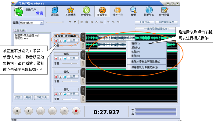 闪乐唱录机截取了传统专业音频软件的音频处理功能,但简化了繁琐的功能按钮,使用户能轻易上手,做到“操作习惯化”——即一师通而百样通,所有功能键都符合用户日常操作习惯,可进行托放、剪切粘贴等一切约定俗成的操作,轻松在PC机上进行混音、录音制作以及音轨编辑、音效调节来录制音频。