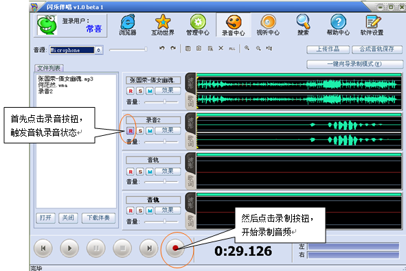 用户可以通过闪乐唱录机进行在PC机上进行录音操作,进行在线K歌,录制自己的个人单曲,也可以通过闪乐唱录机强大的音频处理功能来进行娱乐音频合成制作。