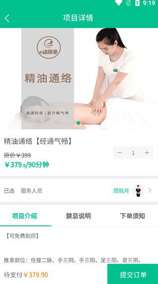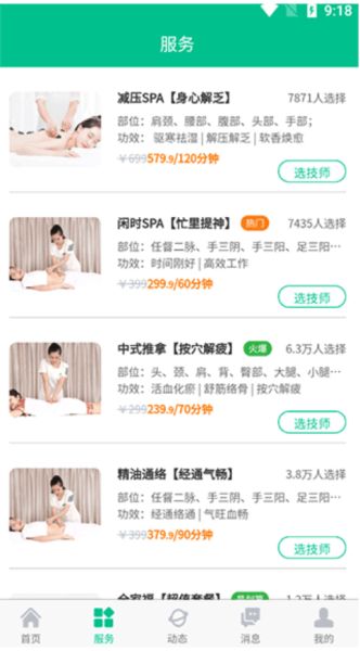 2、服务列表:按照需求选择合适的项目,系统会推荐距离最近的可接单技师为您提供上门按摩服务;