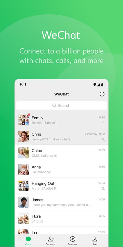 使用文本、照片、语音、视频、位置共享等方式给朋友发消息。创建最多500名成员的群聊。