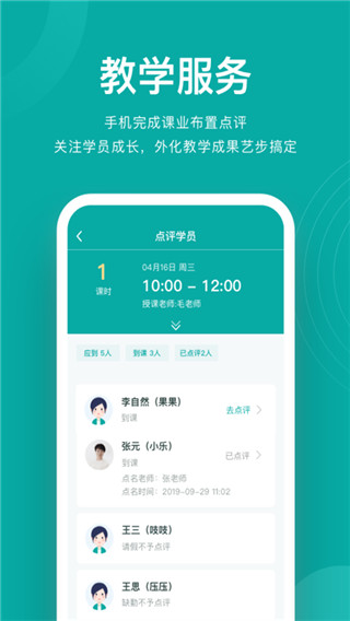 3、智能老师助手,课时课消自动化统计,签到考勤手机完成,学员作业线上批改,不再困于微信群。