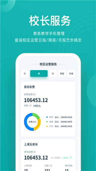 1、数据直观准确:校长端定时提供运营报告,详细统计报名收费,师生课消,出勤数据等,值观数据表多维度展示,全面了解校区精细数据。