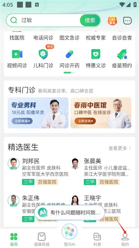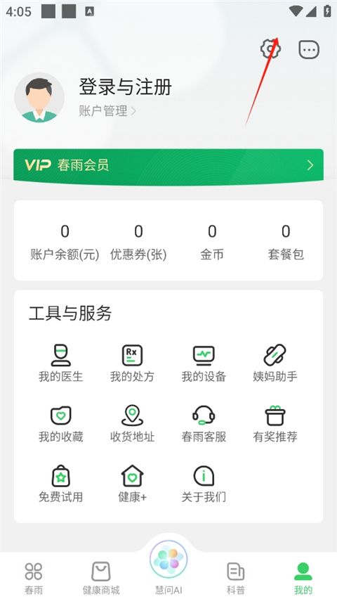 1、打开春雨医生app,点击底部导航栏中的“我的”选项,进入个人中心页面。