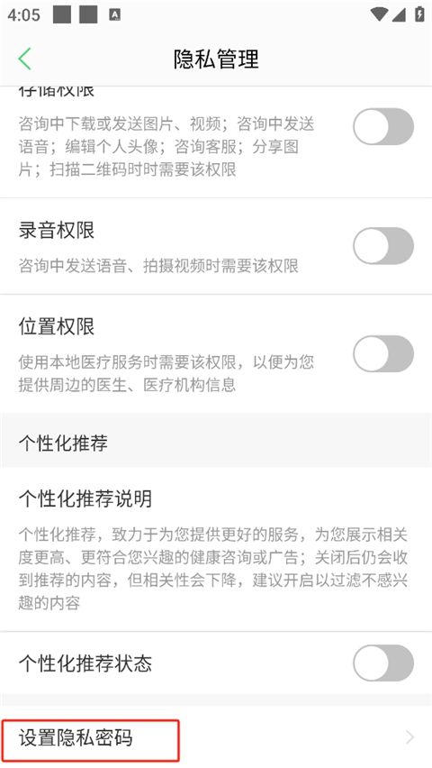 4、在隐私管理页面中,点击“设置隐私密码”选项。按照提示设置隐私密码,这将帮助你保护你的咨询记录和其他敏感信息。