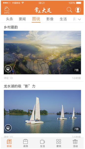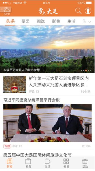 及时获取大足的最新新闻资讯、报道、活动,并且支持随时随地进行分享,是用户掌握大足信息最方便的移动资讯平台