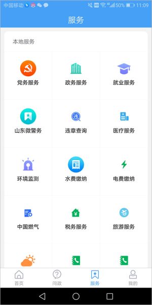 3、【服务】页面上给用户提供了就业服务、水费电费缴纳、医疗服务等,以及申请法律服务,企业招聘、车票预订、公交查询、话费充值等第三方服务