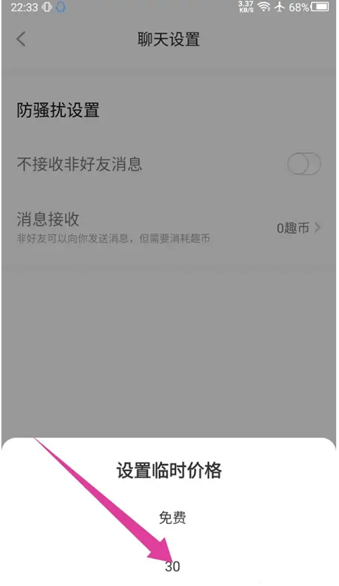 5、把免费0趣豆修改为30趣豆,这样和对方聊天也就收费了。
