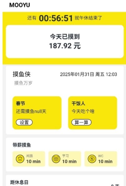 MOOYUapp是一款专为现代职场人设计的智能应用,旨在帮助用户记录和管理日常工作中那些轻松愉快的“摸鱼”时光,同时提供实用的生活辅助功能。它不仅能够记录您在工作间隙的小憩时刻,还能为您规划节假日安排、生成排行榜增添趣味,并提供贴心的食谱推荐,解决选择困难症。无论是忙碌的工作日还是悠闲的假期,MOOYUapp都能成为您生活中的得力助手。