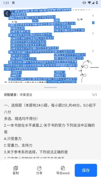 识别完成后,可以复制或分享识别出的文字,也可以保存为Word/Txt格式。
