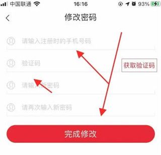 4、进入修改密码界面后,输入您的手机号码、获取验证码、填写验证码、输入新密码、确认新密码,最后点击【完成修改】即可