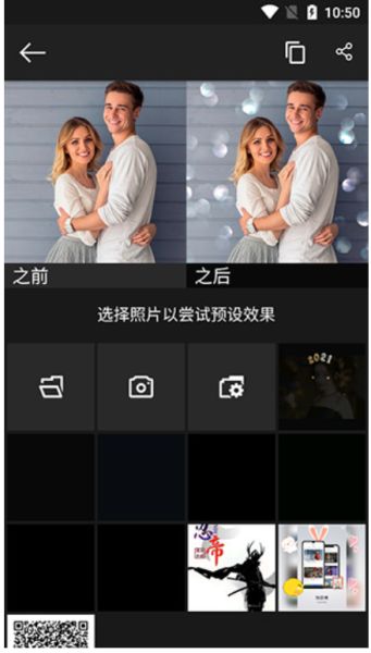 2、点击一种特效,这儿就能看到模板之后的效果,并在此选择照片以尝试预设效果
