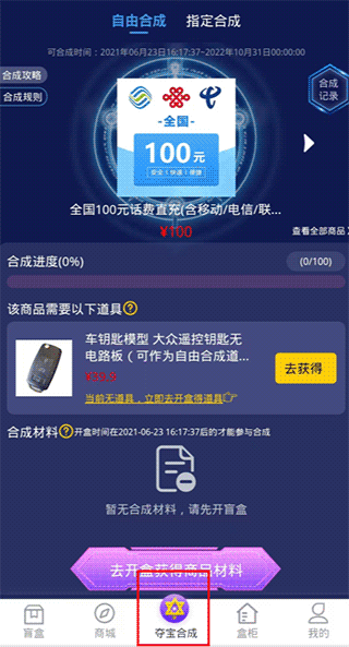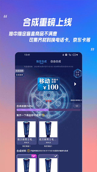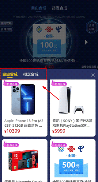 若用户不喜欢盲盒获得的开盒商品,可以参加合成商城的合成活动。合成活动分为自由合成和指定合成: