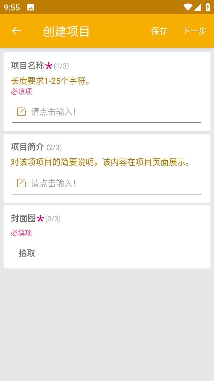 2、添加项目名称与项目简介以及封面图,这三项皆为必填项,然后点击下一步。