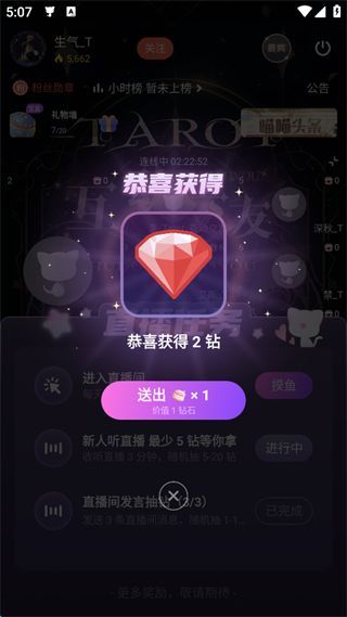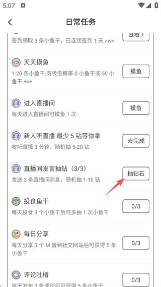 2、可以看到日常任务由任务可以免费获得钻石,点击“直播间发言抽钻”右侧的“发消息”。