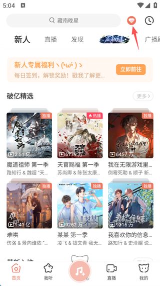 1、打开在本站下载的猫耳FM app,我们可以看都首页有非常多的收听资源,比如直播、广播剧。