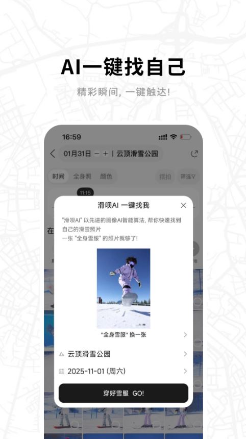 2、GOSKI是按拍摄时间上传照片,滑呗可以按照你的拍照时间,全身照找图还有服装的颜色去找自己的照片,就很容易找到自己照片。