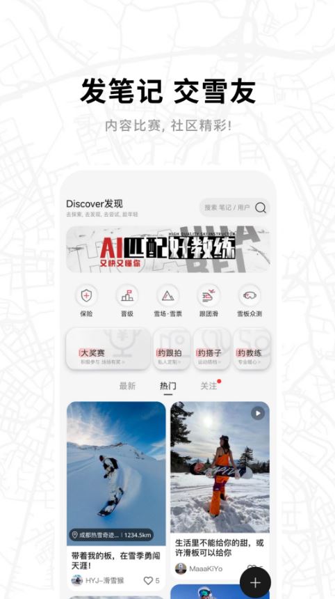 雪友可以随时分享图片、小视频,打造滑雪朋友圈,并可以与他人一同参与滑行晋级互动,参加丰富的摄影大赛。
