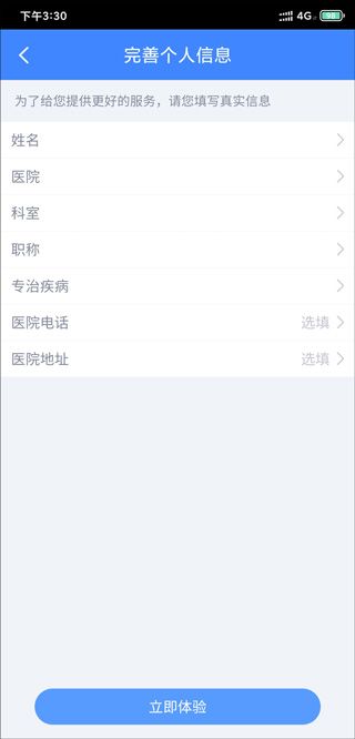 输入姓名、医院、科室、职称--立即体验,完成注册;