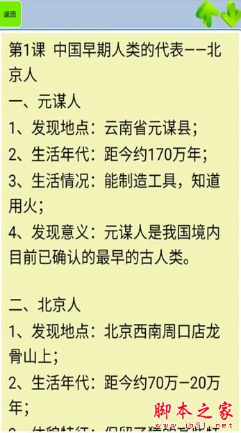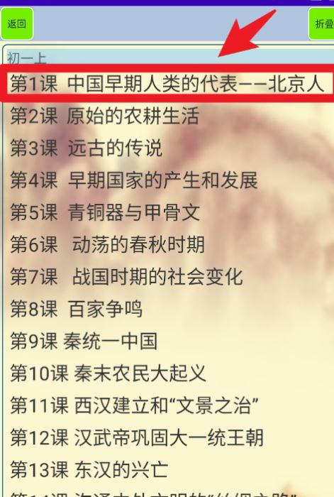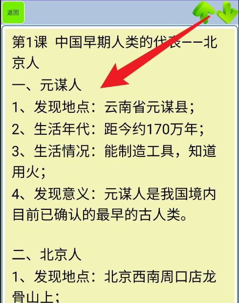 2. 在目录中点选任一课标题,例如「第1课 中国早期人类的代表——北京人」,展开对应知识笔记。