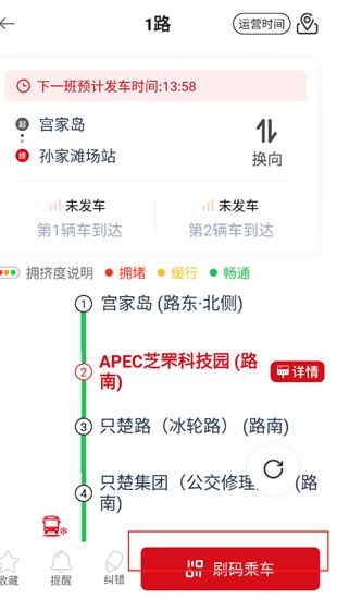 3、系统将自动显示推荐公交路线,点击刷码乘车准备支付。