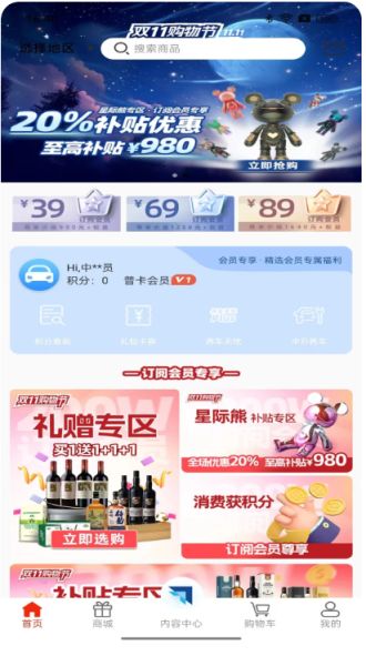 2、礼包卡券:页面中拥有各种类型的优惠卡券资源,使用积分兑换卡券;