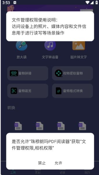 4、例如PDF转Word,接着授予软件必要得到手机权限,如图所示。然后选择文件进行转换即可。