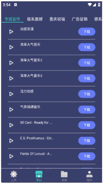 5、其次软件中还提供了丰富点的音频素材资源,如图所示。类型非常多元。点击右侧点的【下载】就能获得到。