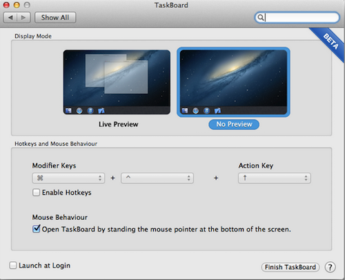 有木有想过将iOS上的应用管理托架移花接木到Mac OS X上?现在,老外们已经先下手为强了:TaskBoard,就是这样一款小插件,在SourceForge上被发现了,做的和iOS上一模一样,可以切换应用,也可以单独关闭应用,触发方式有两种,一个是热键,另一个是将光标移至屏幕底部,未来版本的TaskBoard还会加上全局Trackpad手势操作。