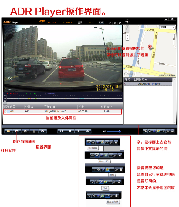 B:卫星定位:ADR右下角第四个按钮(小地图)点开有会出现谷歌地图,播放视频时您可以看到您当前的位置和您的行车轨迹。(地图于实际道路可能会有所偏差,非定位不准所致)