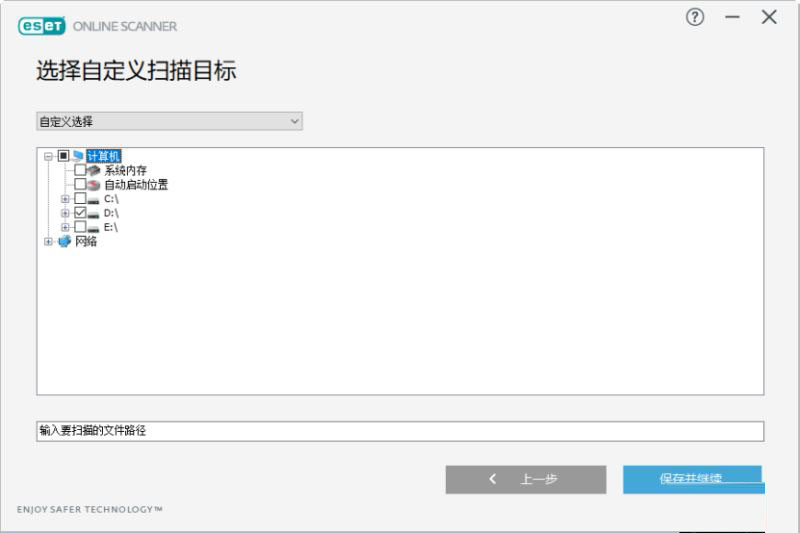 3、以“自定义扫描”为例,单击进入之后在窗口中选择您需要扫描的磁盘或者文件,勾选完成点击“保存并继续”。