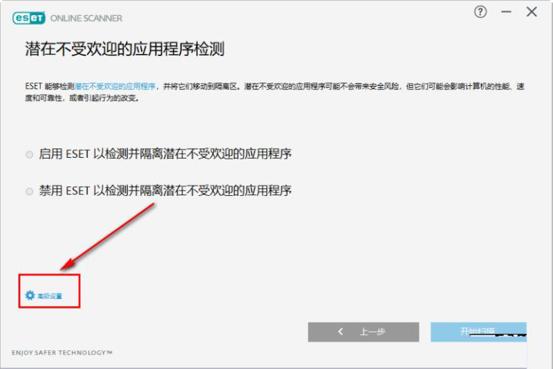 6、如下图为高级设置的面板中,可以按照个人的实际情况打开关闭对应功能,完成之后返回页面,单击“开始扫描”。