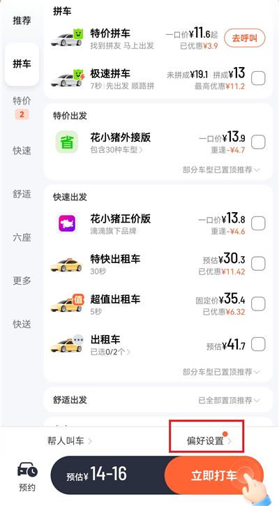1、在打车页面的右下方有一个【偏好设置】,点击。