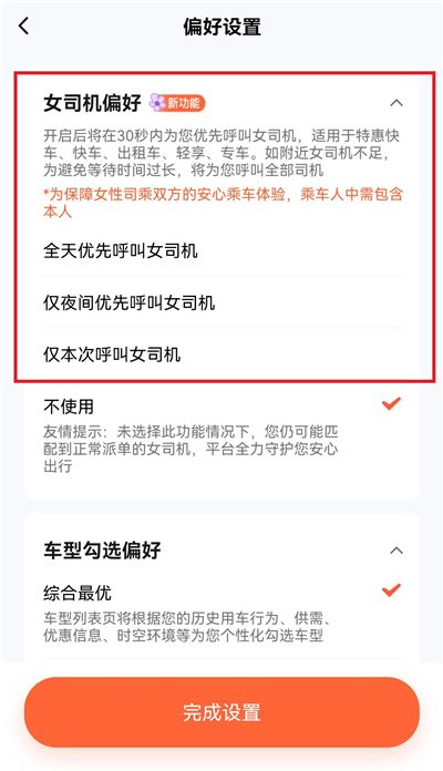 2、你可以开启女司机偏好功能,有三个选项可以选择,选好之后点击下方的【完成设置】。