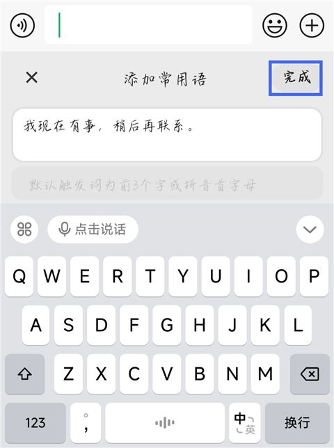 4、输入内容,点击【完成】,常用语就添加好了。