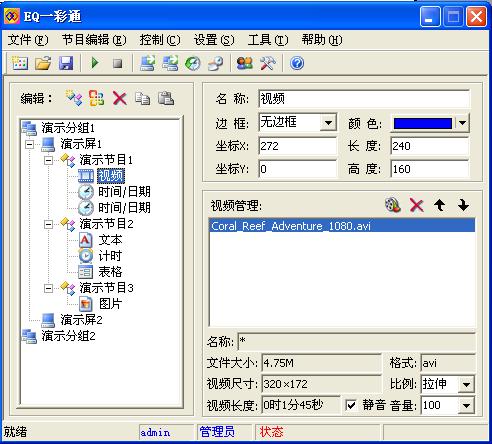 EQ一彩通是一款非常好用且功能强大的节目制作、播放软件,使用方便,简单易学,专为全功能异步全彩/灰度系列LED控制器设计开发。具有强大的节目编辑功能,如:支持多种格式的视频、模拟和数字时钟、正计时和倒计时、多种图片格式、WORD文档和EXCEL表格;还具有丰富的动画方式,支持46种进场动画和47种出场动画;另外,本软件还具有分组管理和多用户管理功能,给用户提供更方便、更安全的显示屏管理。需要此款工具的朋友们可以前来下载使用。