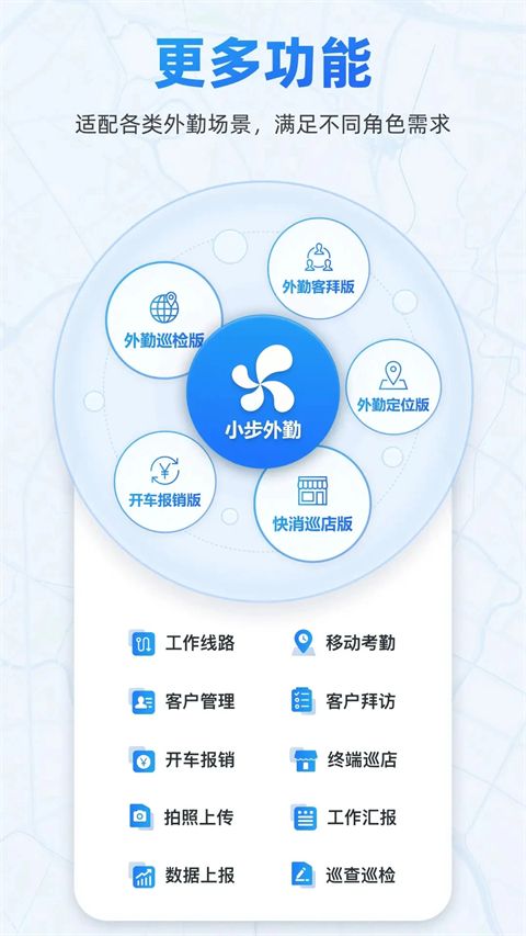 小步外勤app是一款运行在安卓平台下的为企业管理人员提供的手机考勤管理软件。企业管理人员可以直接通过手机和PC平台对外勤员工进行实时管理,实现多地考勤、异地考勤、实时定位、轨迹查看、IM即时通讯、通讯录、水印照片上传、数据上报等众多功能。有需要的朋友可在本站下载使用!