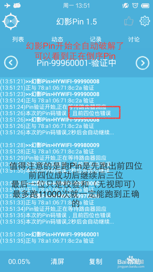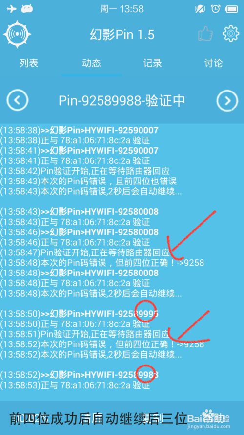 点击开始破解会跳到动态页面,查看破解的进度等信息。图中可以看出幻影Pin正在正常运行,如果你在使用时没有出现红色圈出来字样,属于路由器没有回应前四位的情况,是跑不出来的,还有就是无限Pin死、小超时,最好是换个热点,图中可以看出幻影Pin正在从9999开始逐个pin,我家正确的Pin前四位是9258,迟早会正确的。