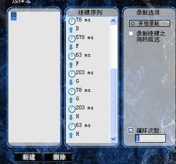 简单地讲,宏就是您可以指定给鼠标按键的一系列的按键动作。准确地讲,就是一系列按键按下与释放的事件,记录每次按键按下、释放以及延迟。其中延迟可以自动录入,即按键按下与释放之间或者按键释放与按下之间所用的时间可自动输出(建议在游戏中延迟的时间在100ms以内)。