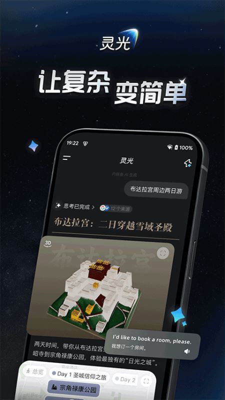 1、输入详细的目的地、关键词和你的要求,灵光App会自动生成大量的相关信息。