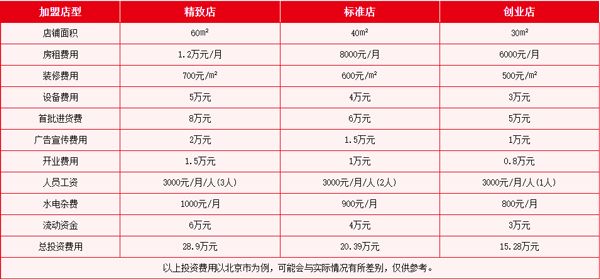 加盟费用根据不同店型可以划分不同的加盟费用等级,下表是以北京市为例,可能会与实际情况有所差别,具体情况可以拨打酒便利招商加盟电话 0371-68998068 进行咨询。