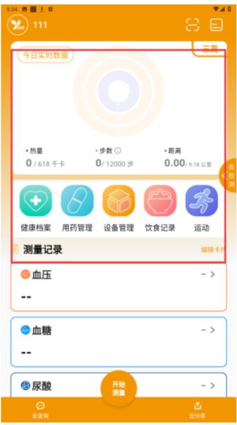 2、查看热量、步数数据,点【健康档案】等功能管理健康。
