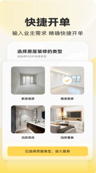 还可以通过软件按照客户的需求选择对应的装修类型进行开单,在平台就能一键快速开单;