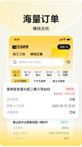 匠猫师傅平台提供海量的装修施工单,您可以主动接单,也可以提前储备订单,确保订单的连续性和更灵活的工作时间。