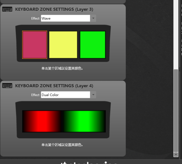 先选择颜色 来设置键盘背光 可以看到有L1~L4 4个模式可以定义 点击下拉箭头 依次是:正常模式、游戏模式、呼吸灯、波浪模式、键盘双色、音乐模式 除了音乐模式其他的区域颜色都是可以自定义