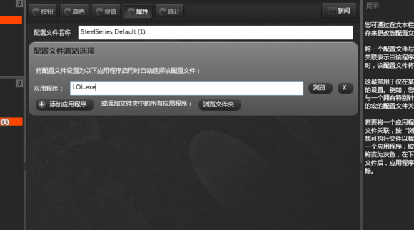 属性:这个是一个比较有意思的功能 可以把之前的配置模式与应用程序捆绑 打开应用的时候自动启用这个程序 比如游戏
