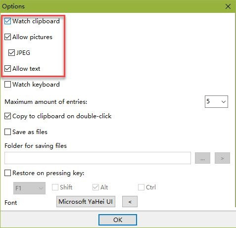 当软件在后台运行时,会监视剪贴板内容的更改并自动收集相关内容,每次更改作为一个条目,记录在软件窗口中。但我们会发现,软件默认只监视文本信息,复制的图片信息不出现在窗口记录中。如果需要监视图片信息,点击“View→Options”菜单命令,在弹出的窗口中选中Allow pictures选项,并将下边的JPEG选项也选中,这样就可以监视图片的复制了。