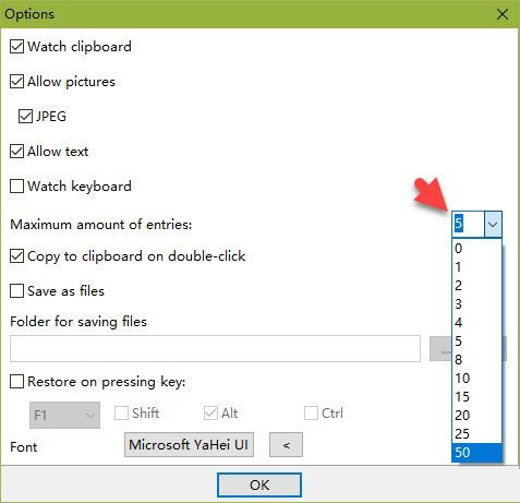 由于软件默认最多监视5条项目,因此若需要监视和记忆更多项目,可通过设置窗口,设置Maximum amount of entries的值,最多可设置为50条。