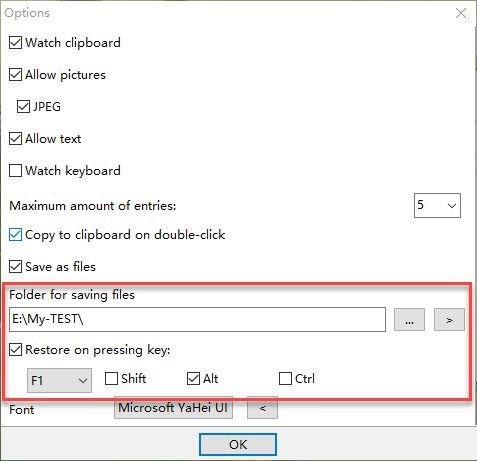 用上述方法保存的信息仅仅是存留在内存中,关机之后这些信息将消失。如果在重新开机或以后需要重复使用这些信息,可在软件Options窗口内将“Save as files”复选框选中;在下方指定保存的文件夹位置,这样就可以将复制条目保存成文本或图片文件了。若需要指定软件恢复热键,可由功能键下拉框给出的键位和Shift、Alt、Ctrl控制键随意组合。