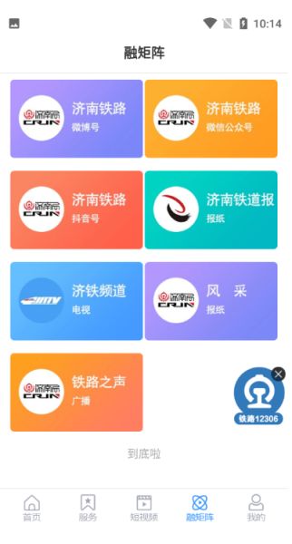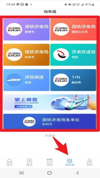 4、点击底部“动车组”按钮,查看铁路局各类官方媒体账号、电视节目及融媒体内容。