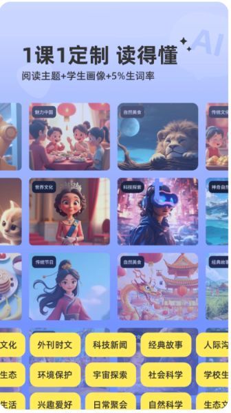 它能根据孩子的词汇储备精准定制阅读材料,个性化词汇画像,语篇难度适合,通篇生词率5%,孩子努努力就能看的懂。